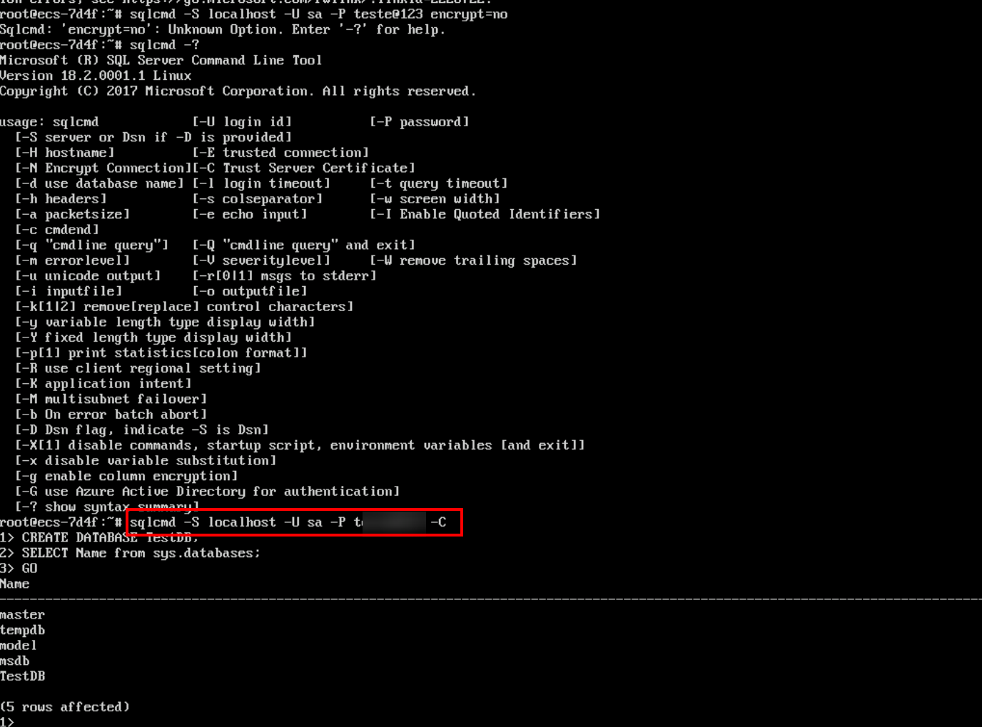 sqlcmd -S localhost -U sa -P '<YourPassword>' -C