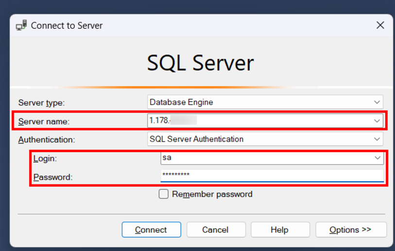 To log in to the SQL Server instance running on the Linux instance, select the authentication option “SQL Server Authentication” and Server Type of “Database Engine”. The default user configured during the SQL Server installation is “sa”. Click “Connect” when the login data is entered.