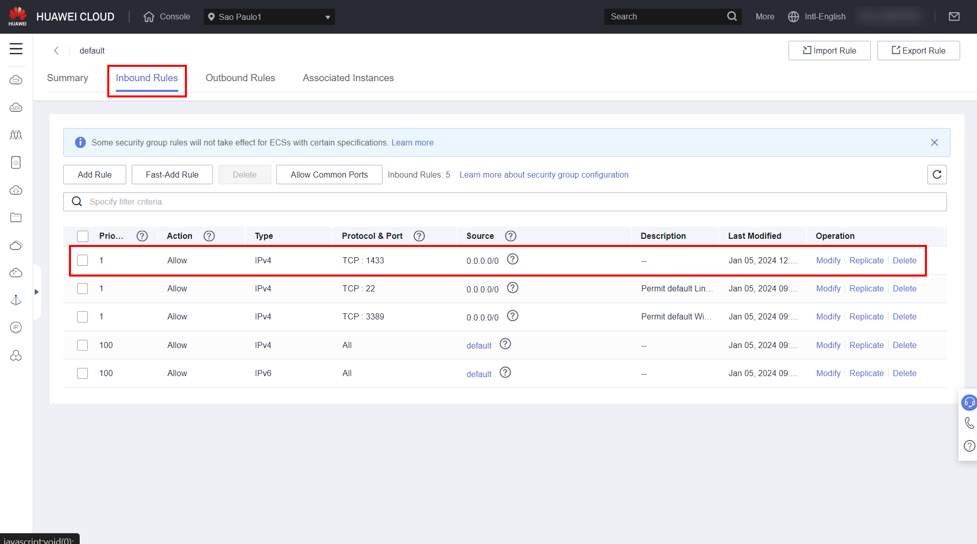 Navigate to the Security Groups section in the Huawei Cloud console. Click on the security group associated with the created ECS and add a rule for the default SQL Server port 1433.