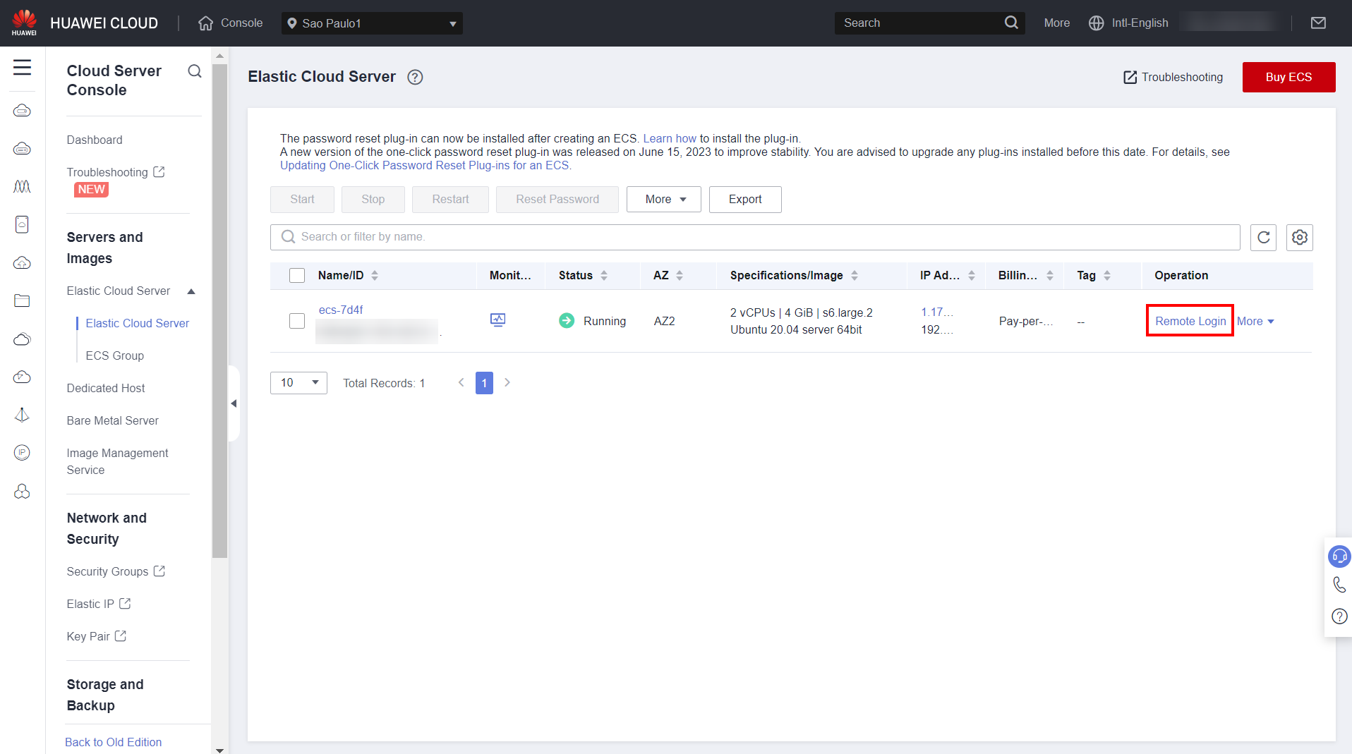 Return to the ECS section in the Huawei Cloud console and access the created instance by clicking “Remote Login”. Log in as the “root” user with the password configured when creating the instance.