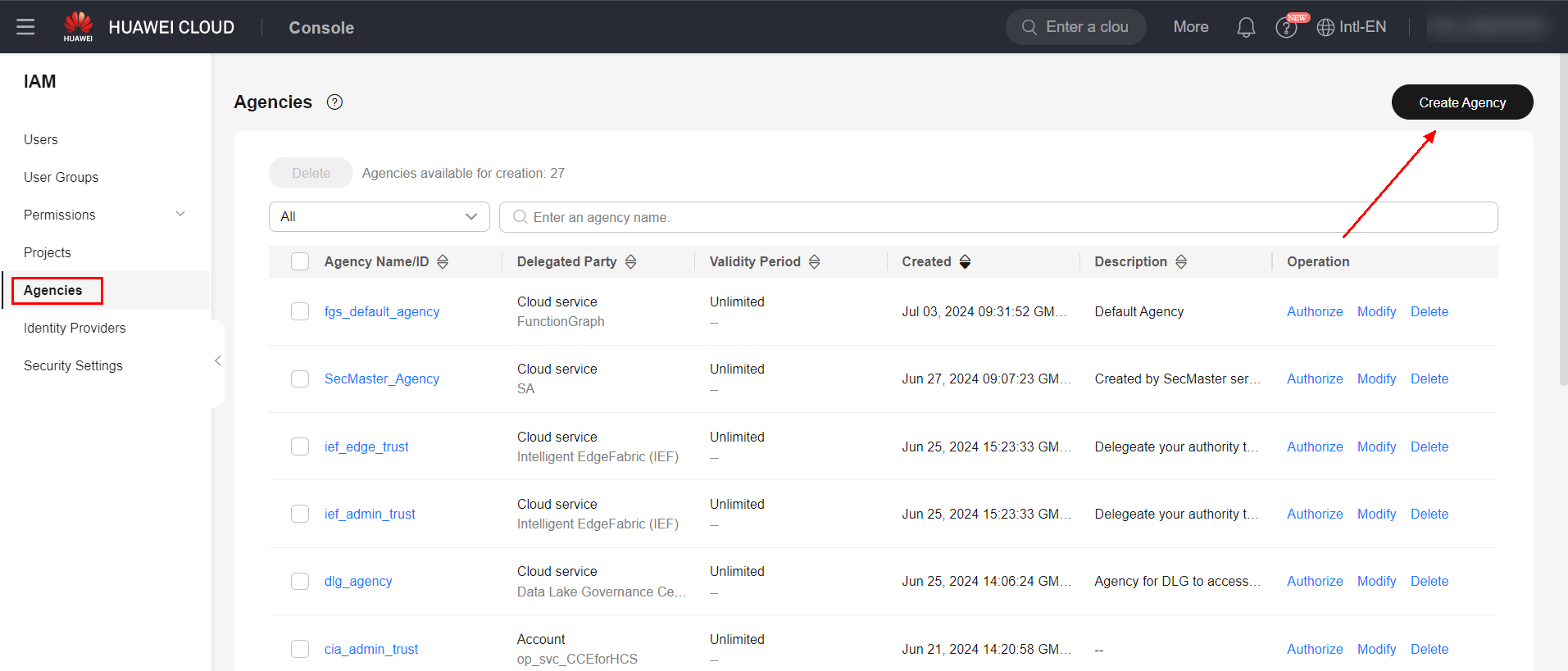 To delegate permissions from the SWR service to FunctionGraph, you need to create an agency with permissions over SWR. Navigate to the IAM service in the Huawei Cloud console and click the “Agencies” page.