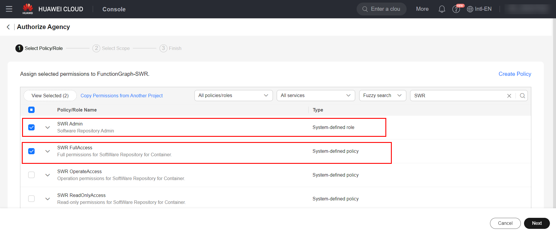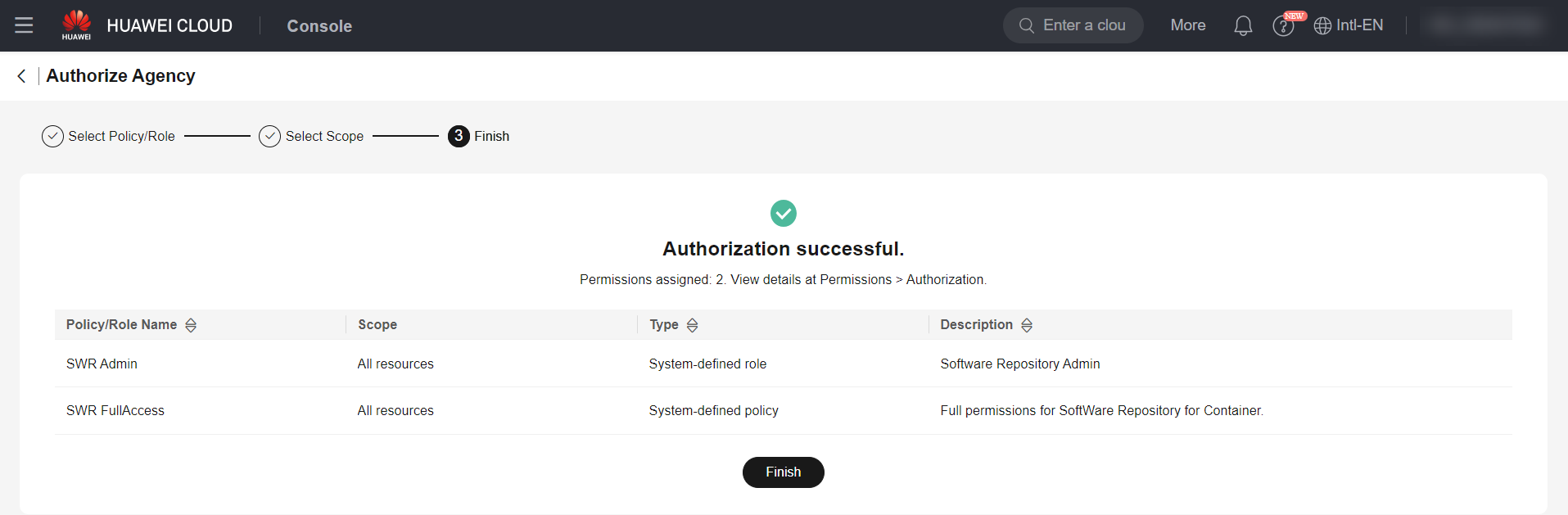 Delegate “SWR FullAccess” and “SWR Admin” permissions to the agency and click “Next” and then click “OK” to finish.