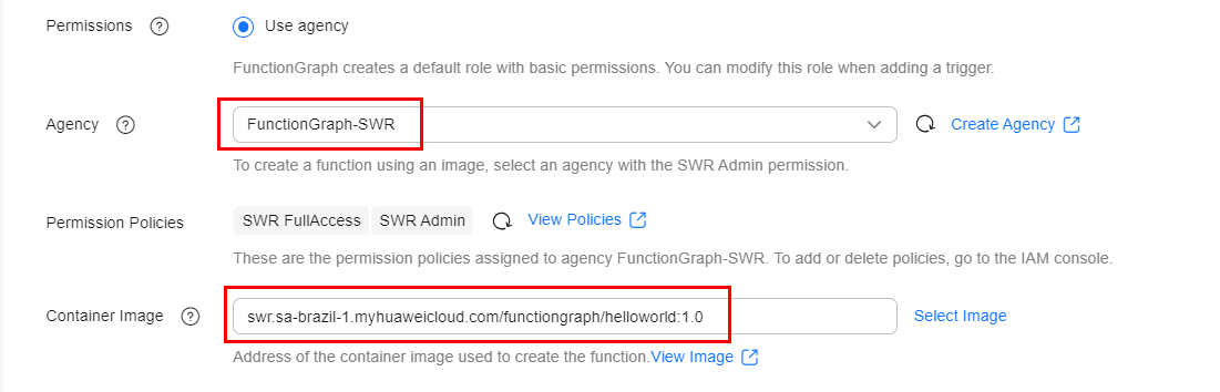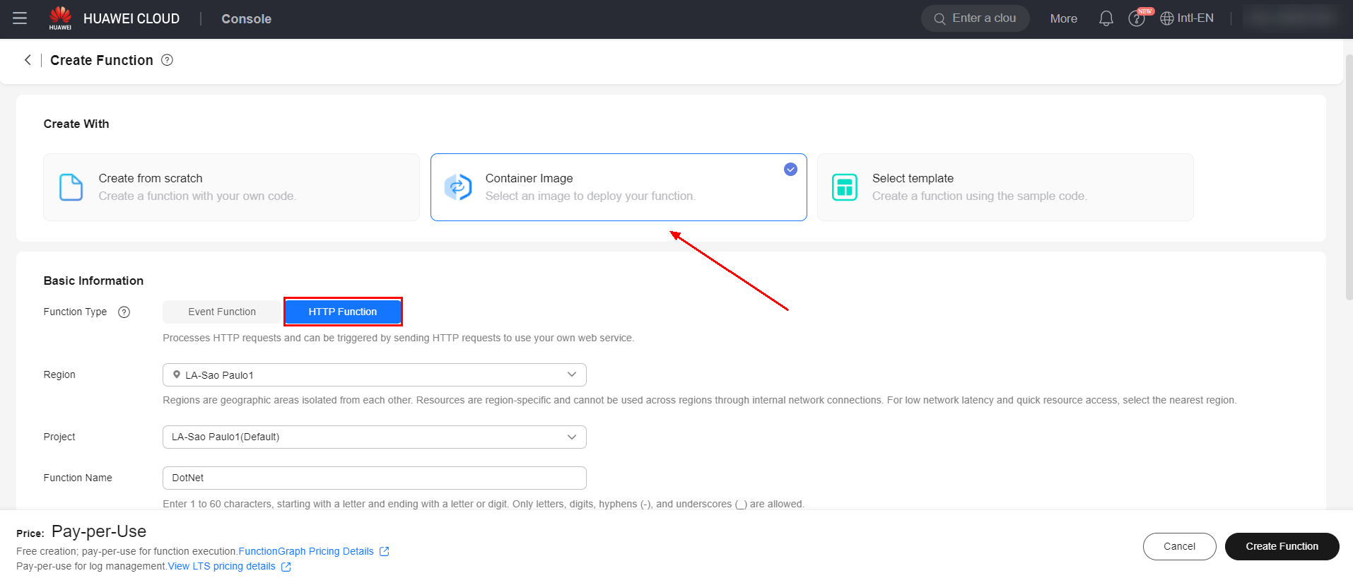 Select the “Container Image”, “HTTP Function” option, give the function a name, select the agency created in item 4.0 of this document, and select the SWR image.