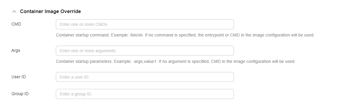 You can also configure additional container options, such as the CMD startup command, execution arguments, User ID, and Group ID.