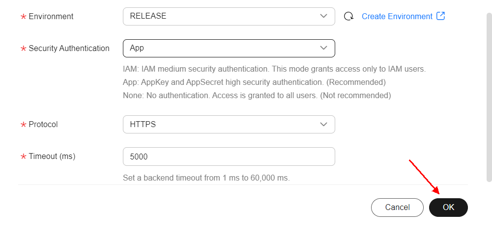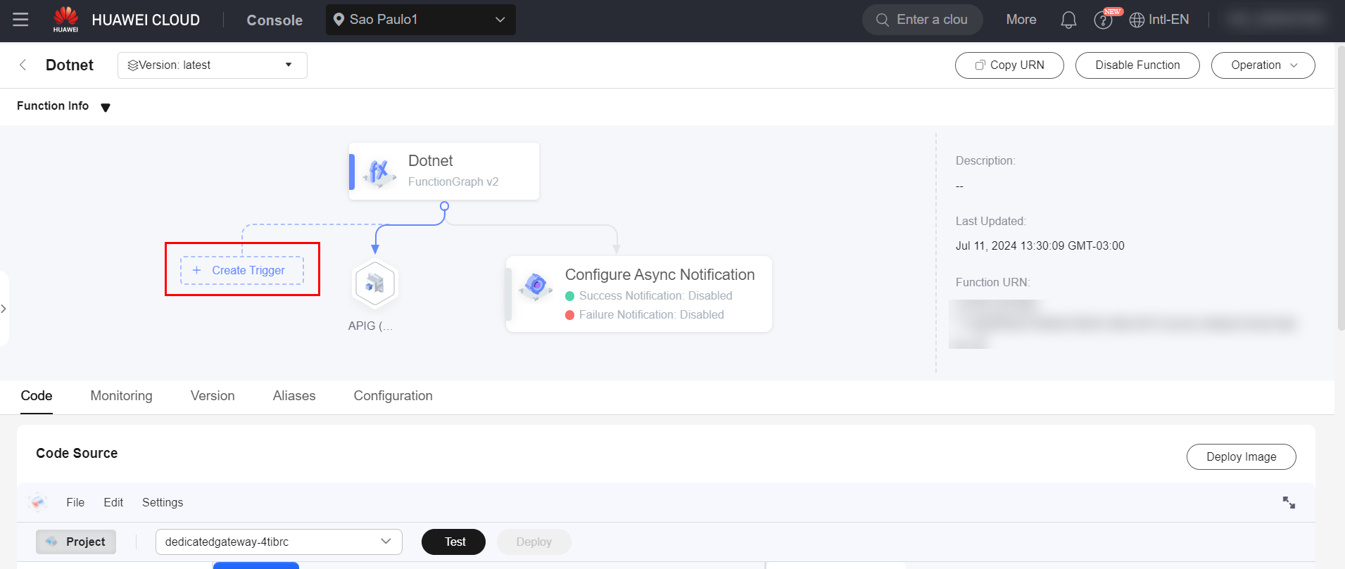 Finally, just configure a trigger for the function. In this example, the trigger that will call the FunctionGraph function will be an API Gateway from the HWC APIG service. To create a trigger, just click on “+ Create Trigger” and configure the APIG instance, filling in the API Group, Environment, Security Authentication, protocol and timeout.