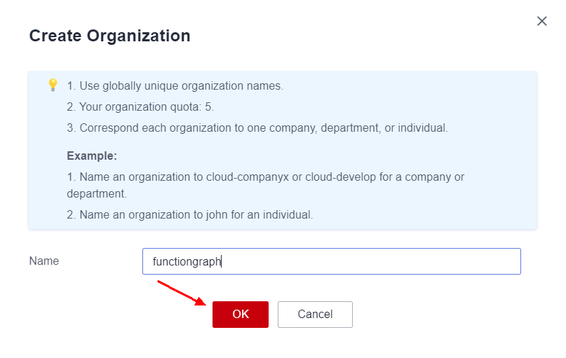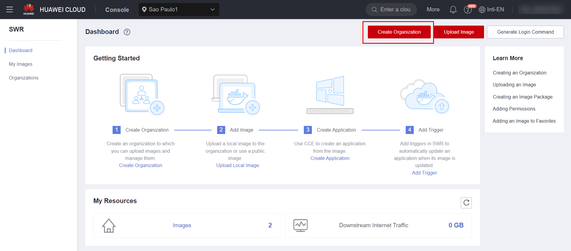 Access the SWR service panel in the HWC console and click “Create Organization”. Fill in the field for the organization name and confirm its creation by clicking “OK”.