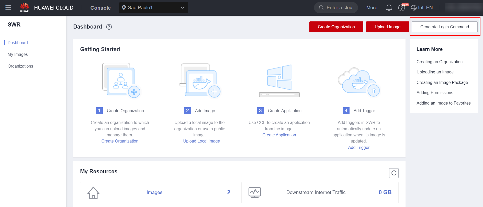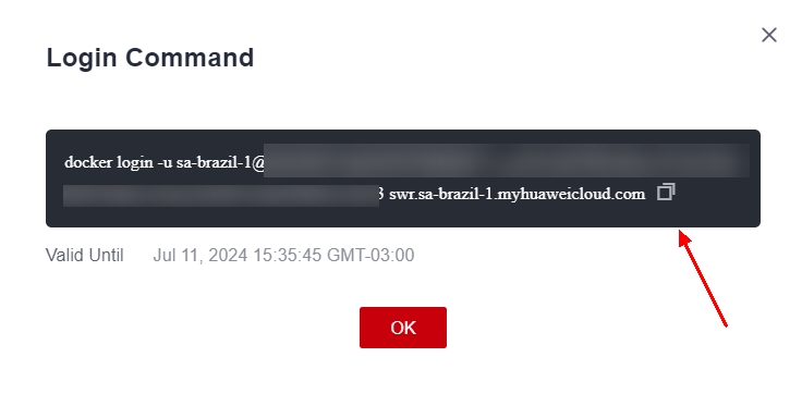 Once the Organization has been created, click on the button related to “Generate Login Command” and copy the generated command that will be used to perform Docker authentication with the SWR repository.