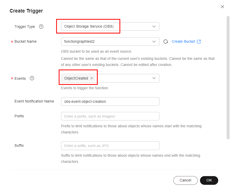 It is also possible to configure a prefix and a suffix of the specific objects that will trigger the function, by configuring a Prefix or Suffix.