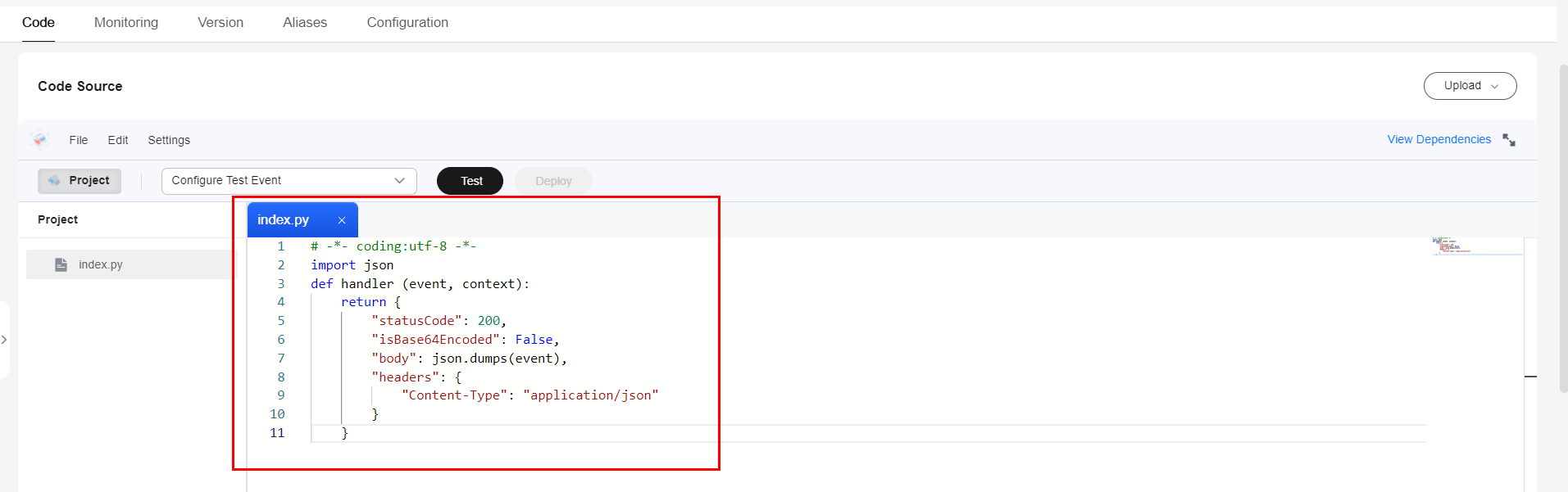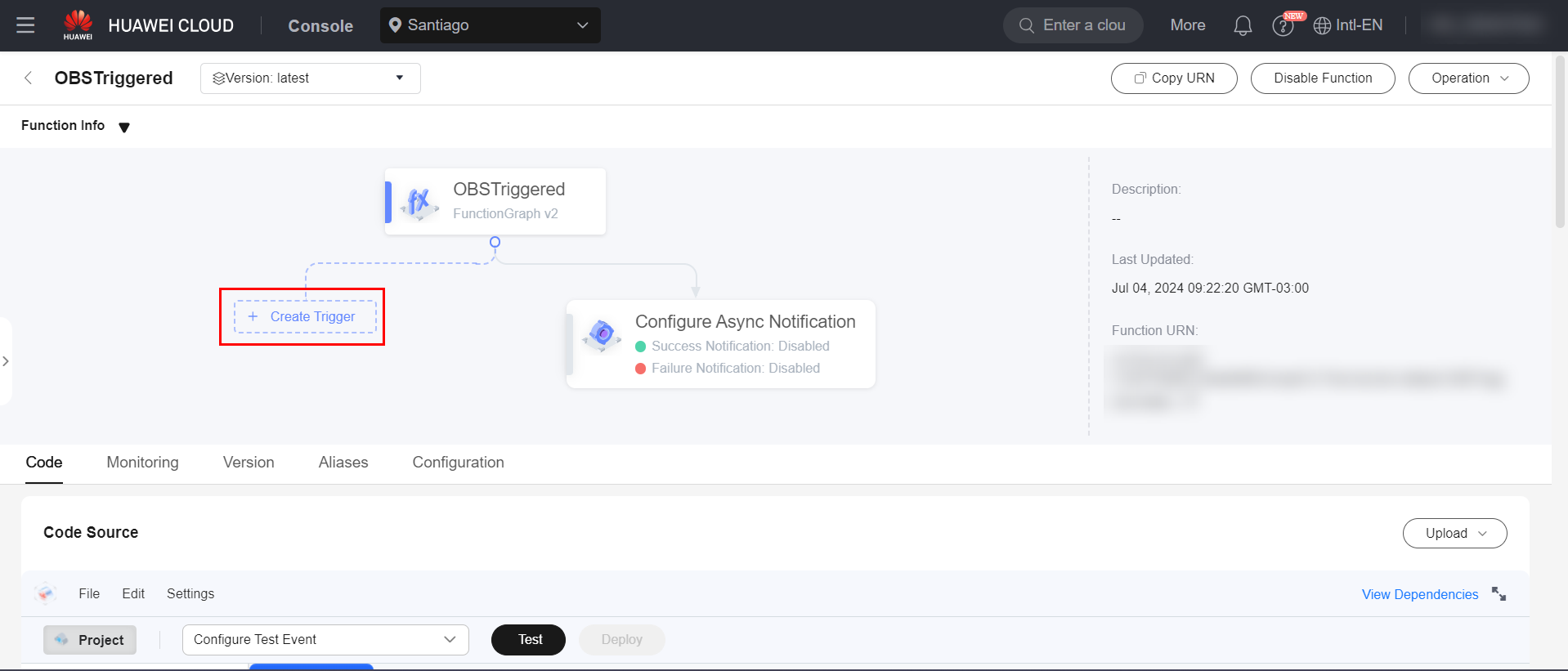 Having created the trigger, now simply import the code that will be executed by the function in Code Source, such as APIs.