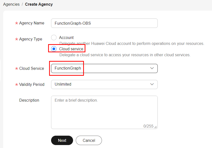 Give the agency a name, select the agency type as “Cloud Service”, and select the FunctionGraph service. Click “Next” to proceed.