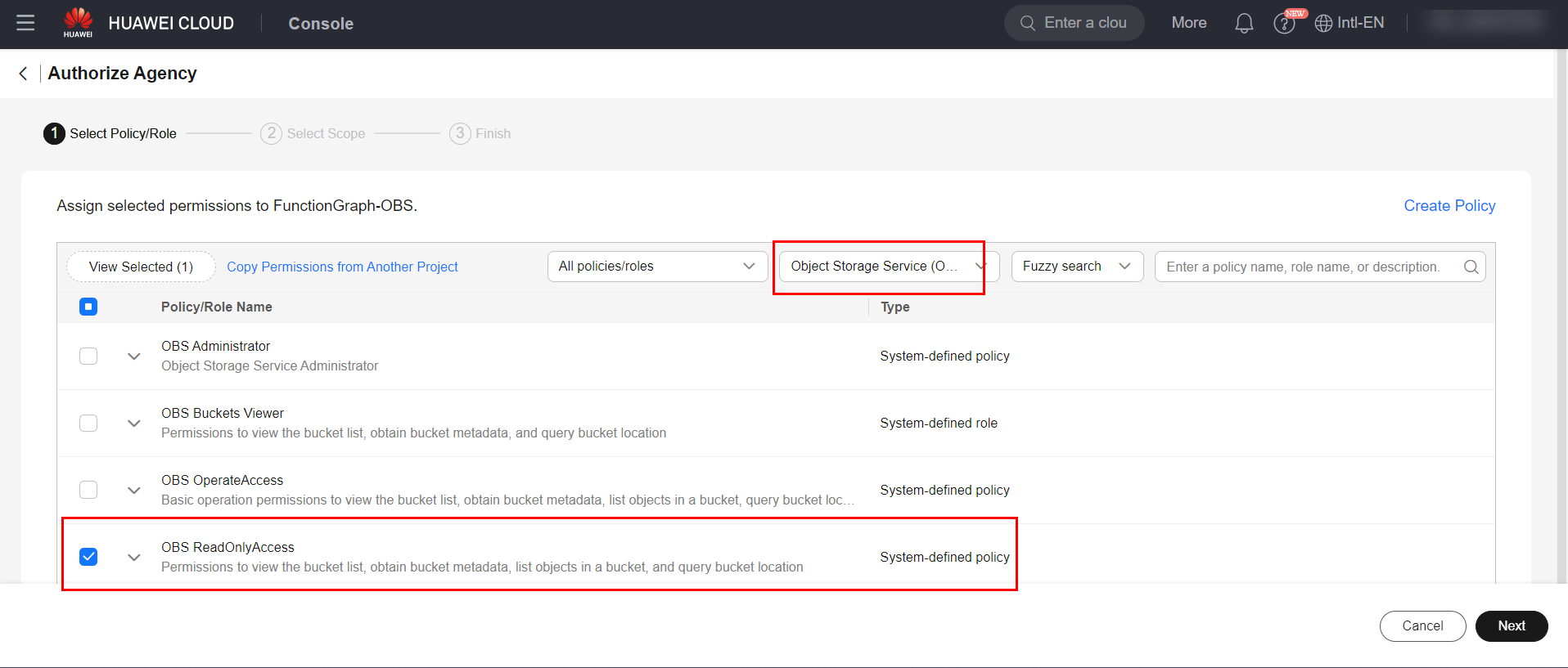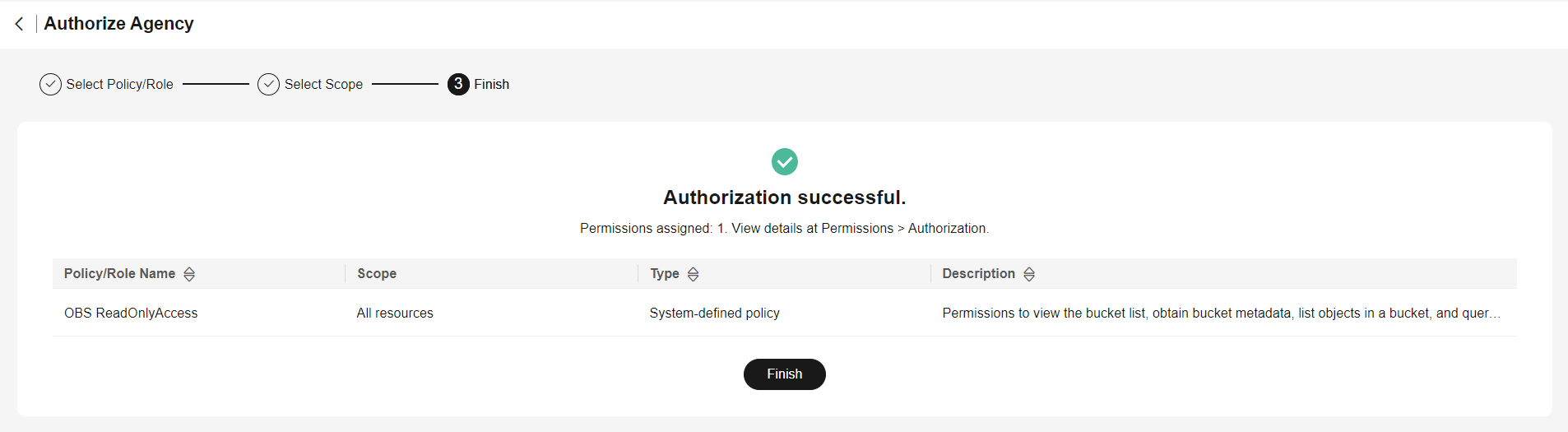Delegate “OBS ReadOnlyAccess” permissions to the agency and click “Next” and then “OK” to finish.
