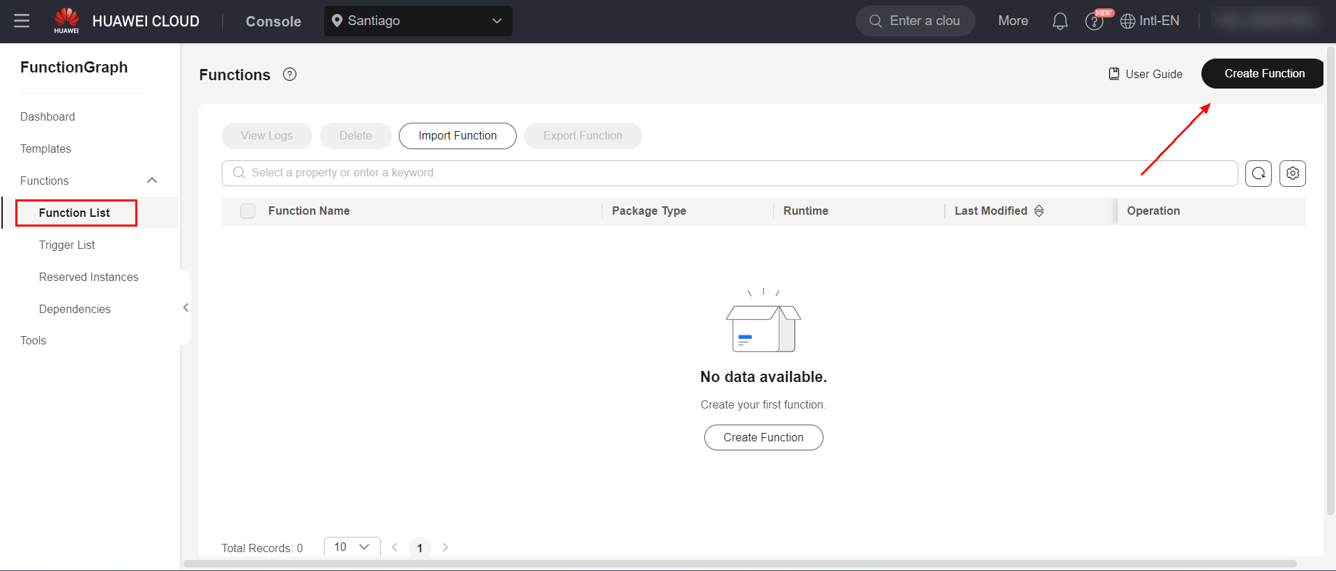 Access the FunctionGraph service in the Huawei Cloud console and navigate to the Functions > Function List page. Click “Create Function”.
