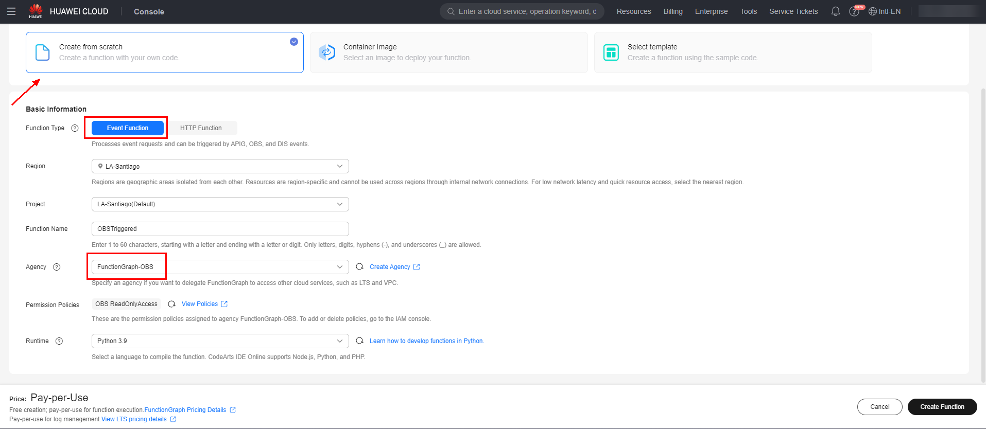 Select the “Create from scratch” option, give the function a name, select the runtime in which the function will be executed, and select the agency created in item 2.0 of this document.