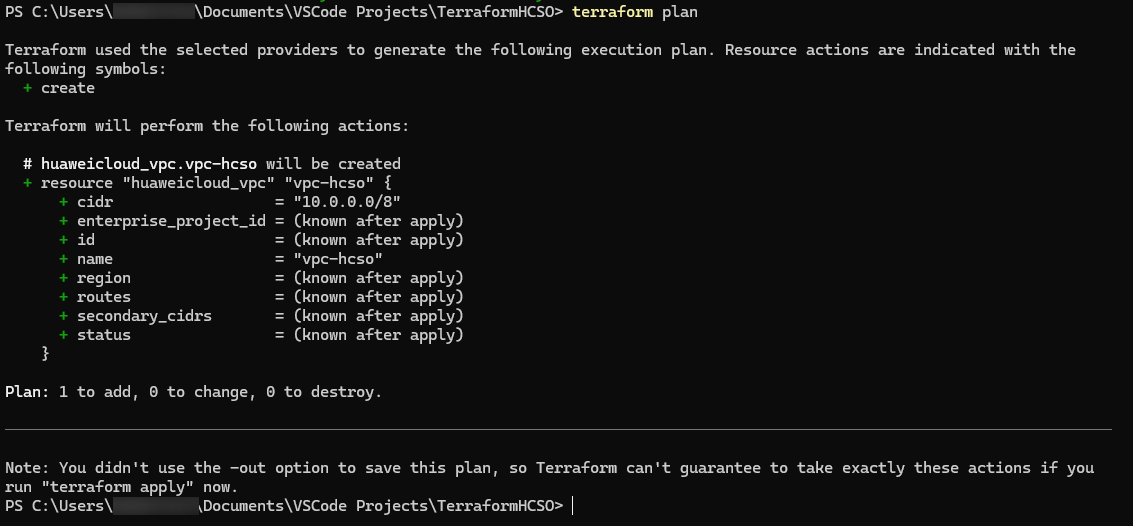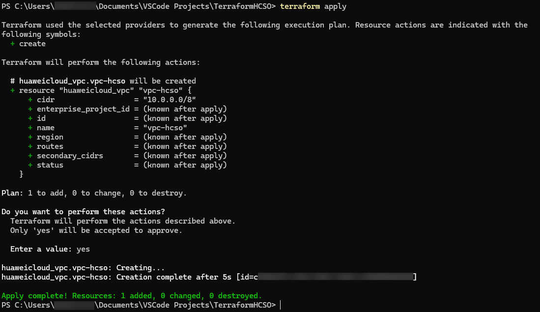 Below is an example of validating the configuration performed in the Terraform tool, as well as the result in the HCSO console: