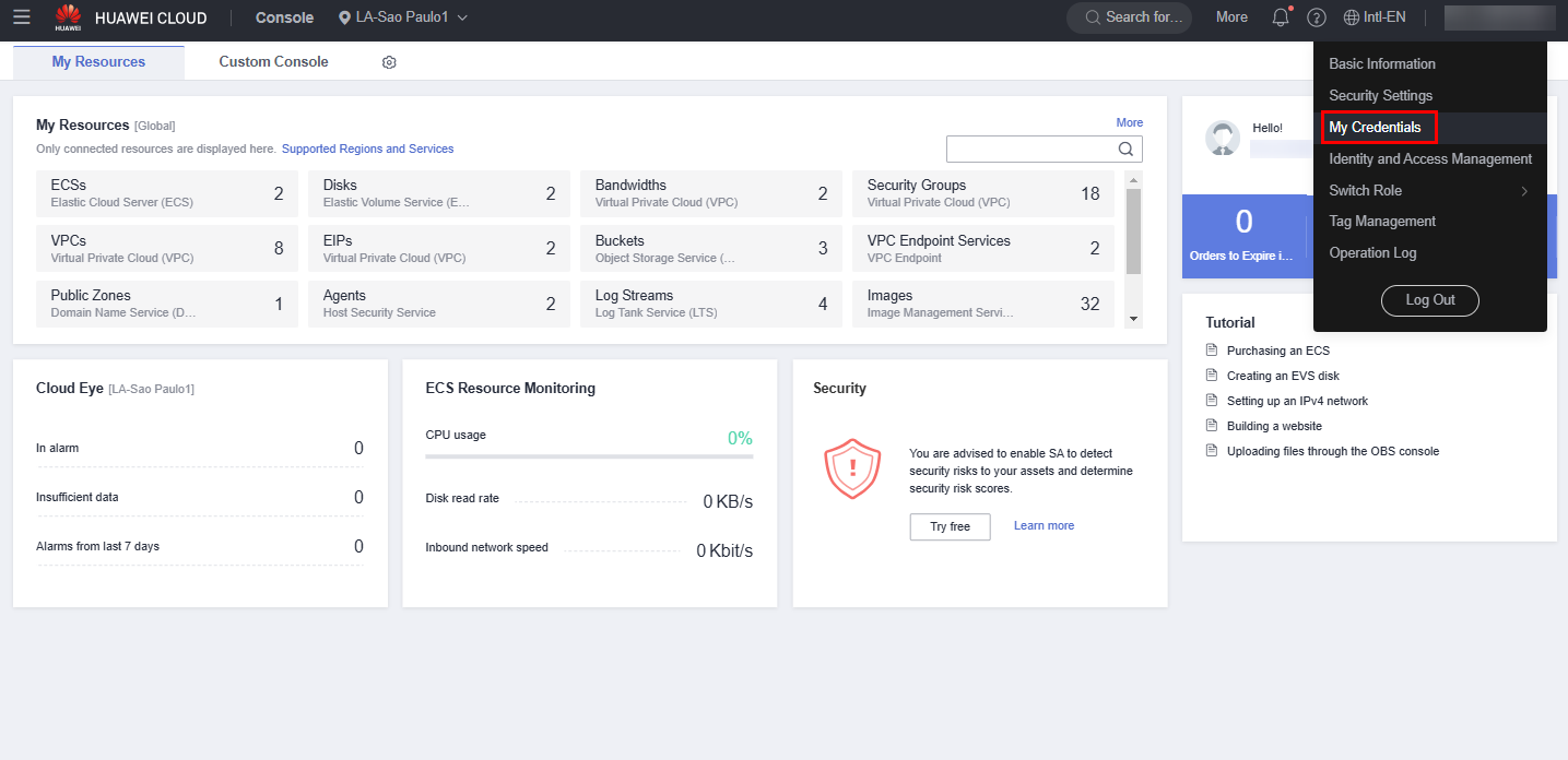 To do this, access the Huawei Cloud console, hover over the account name in the upper right corner and click “My Credentials”. Once done, click “Access Keys” and “Create Access Key”.