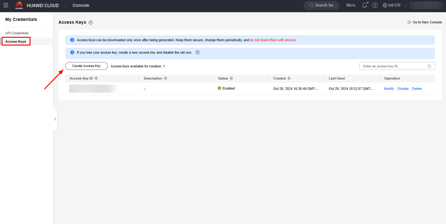 Note: The permissions of the created AK/SK key will be inherited from the user who created it. If you encounter any permission-related issues, refer to the following IAM permissions documentation to delegate the necessary permissions: https://support.huaweicloud.com/intl/en-us/productdesc-iam/iam_01_0036.html.