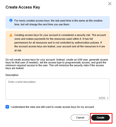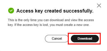 If a warning window appears, accept the credential creation and click “Create” followed by “Download” to download the AK/SK key pair.