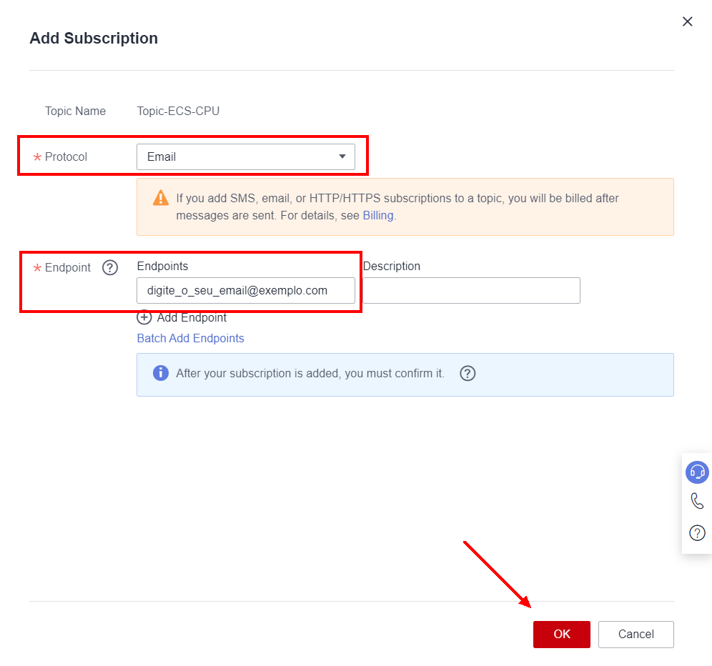 Next, choose the protocol for sending the notification, in this case Email, and enter the chosen email in Endpoints. Click OK.
