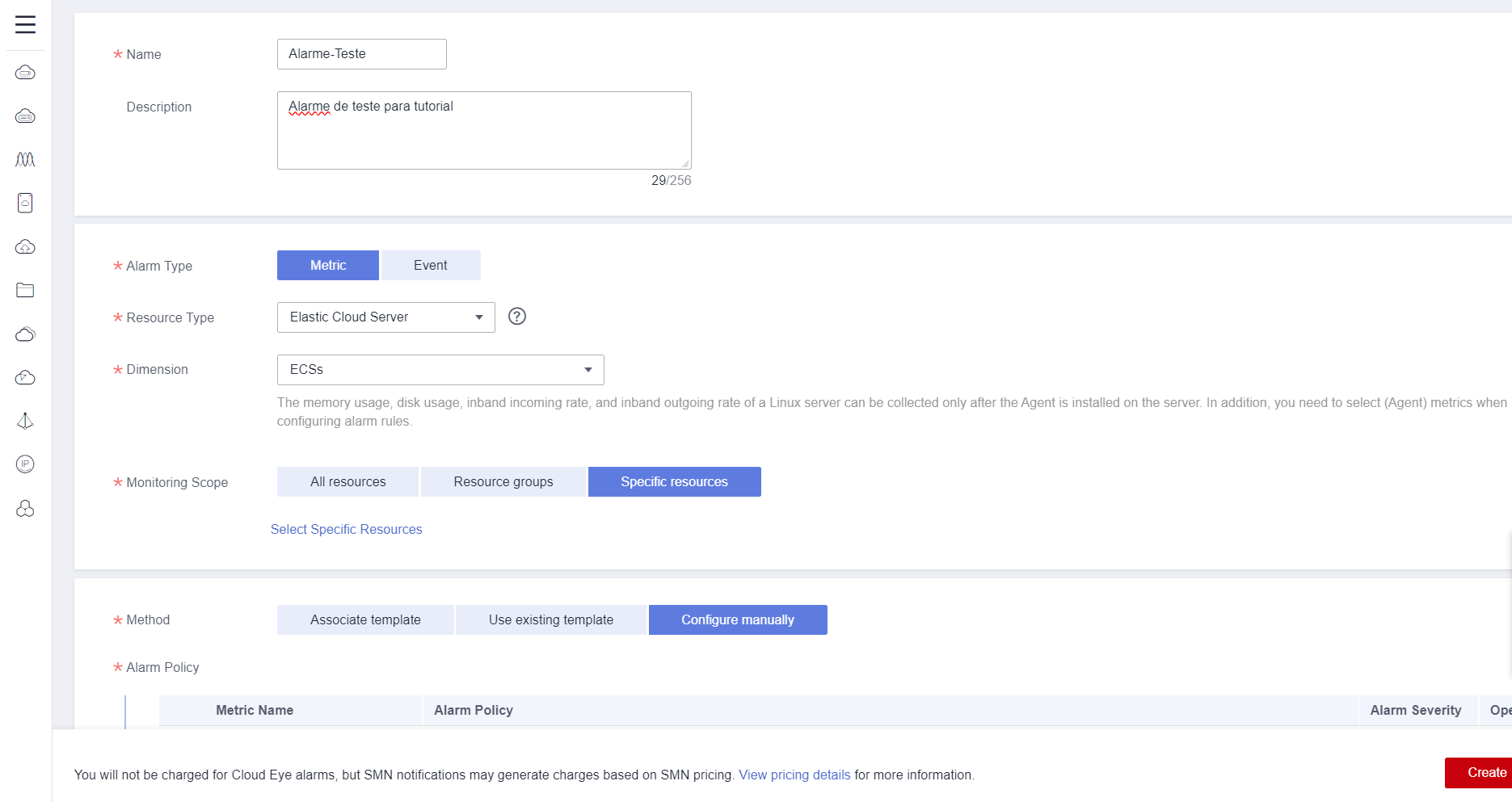 In this example, the metric that will be configured to trigger the alarm will be if the ECS CPU usage is greater than or equal to 80%. In Metric Name, it is possible to select the metric that can trigger the alarm, as in this case it is (Agent) CPU Usage (Recommended). For this option to be selected, the Cloud Eye agent must be installed, as done in section 3.5. It is important that the agent is installed on monitored servers to obtain better accuracy in data monitoring and a wider range of monitoring metrics.