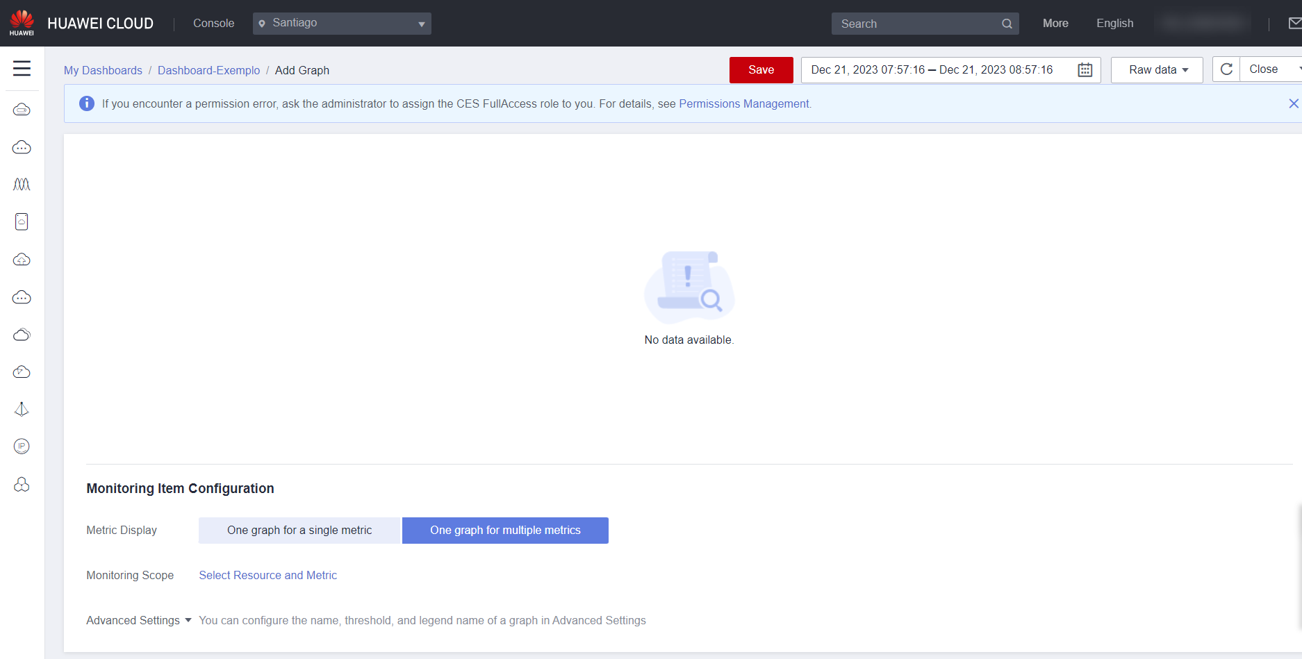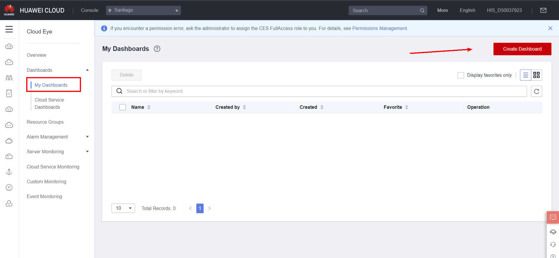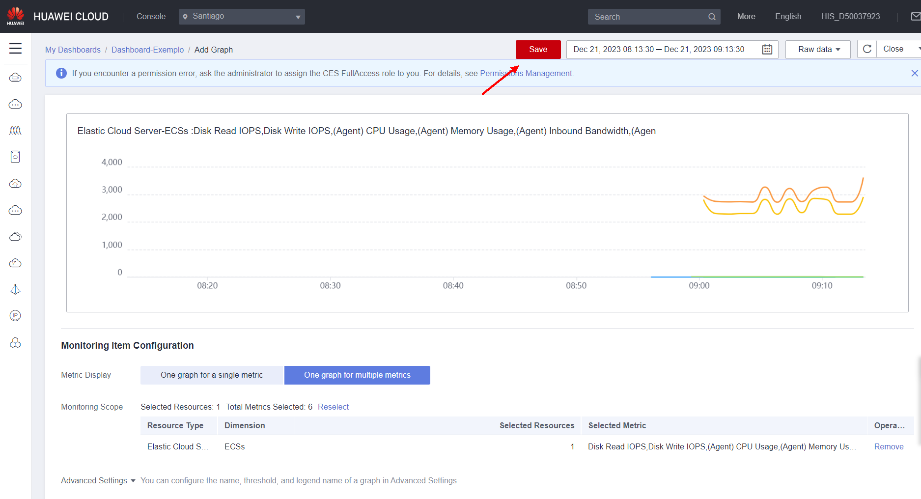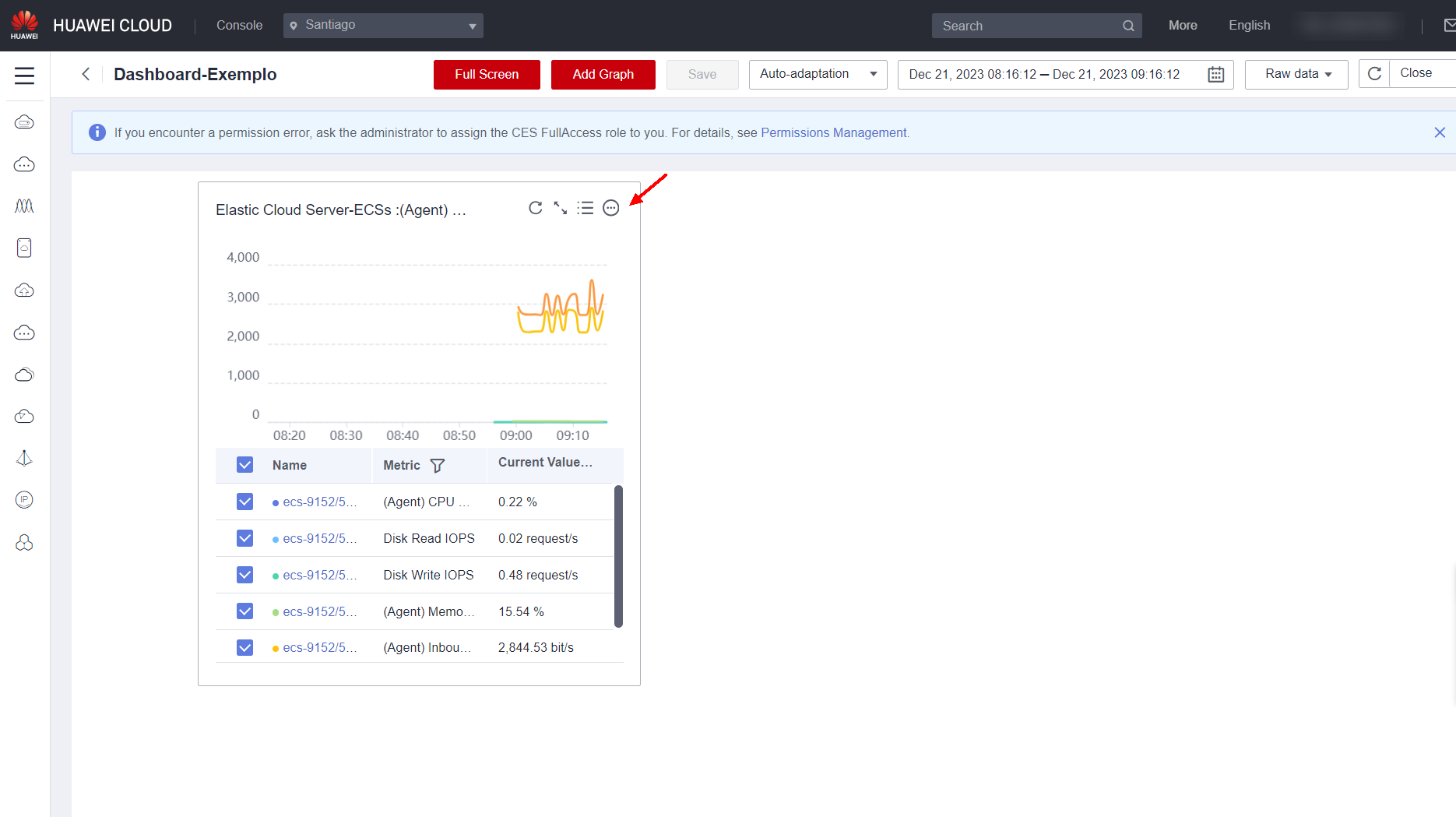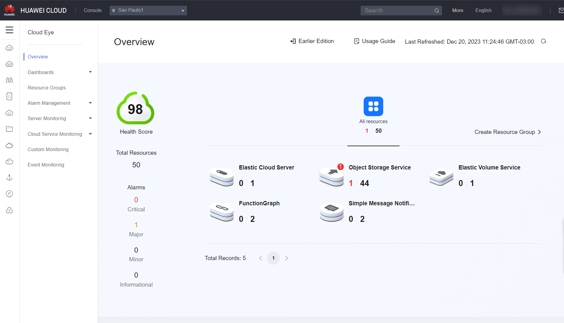 In Cloud Eye, you can create numerous dashboards with several graphs in each dashboard, and each graph can show multiple monitoring metrics. In addition, as described in topic 3.1, in the CES Overview section, you can have an overview of the monitored resources with the main metrics used, such as CPU, memory and disk usage on servers; network usage and a total of alarms triggered in Cloud Eye.