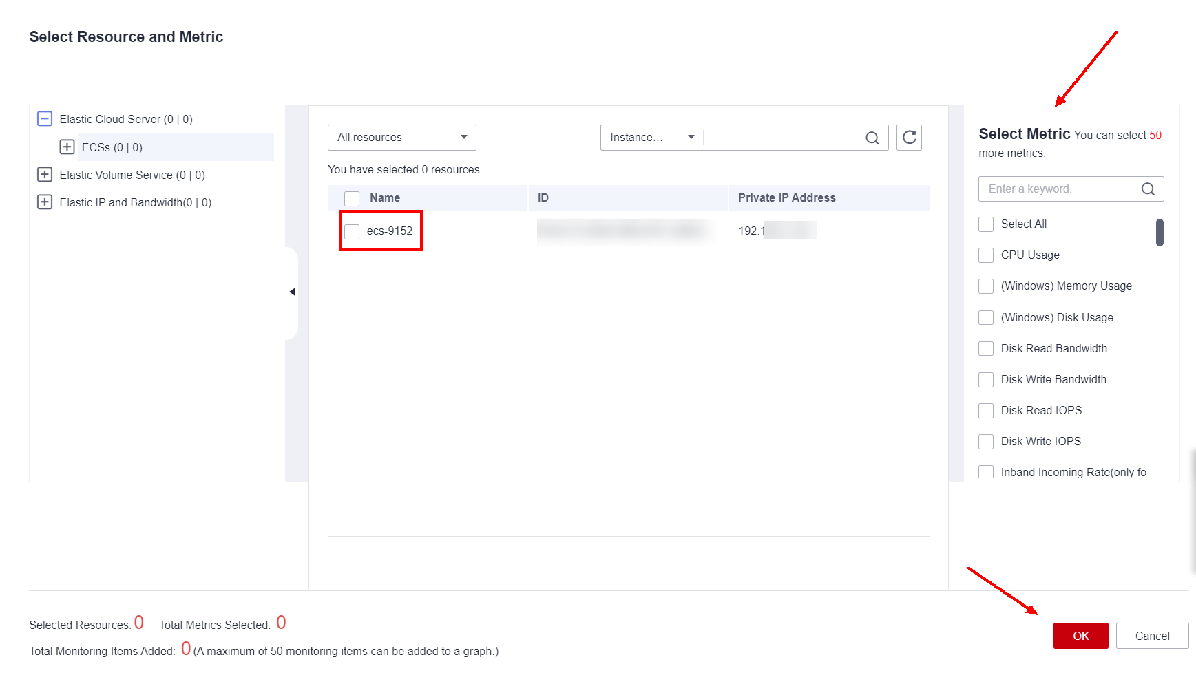 Select the type of service to be monitored on the left side of the Select Resource and Metric page, the specific resource to be monitored in the middle area of the page, and the metrics for that resource on the right. In this example, CPU, disk, memory, and network usage will be monitored on “ecs-9152”.