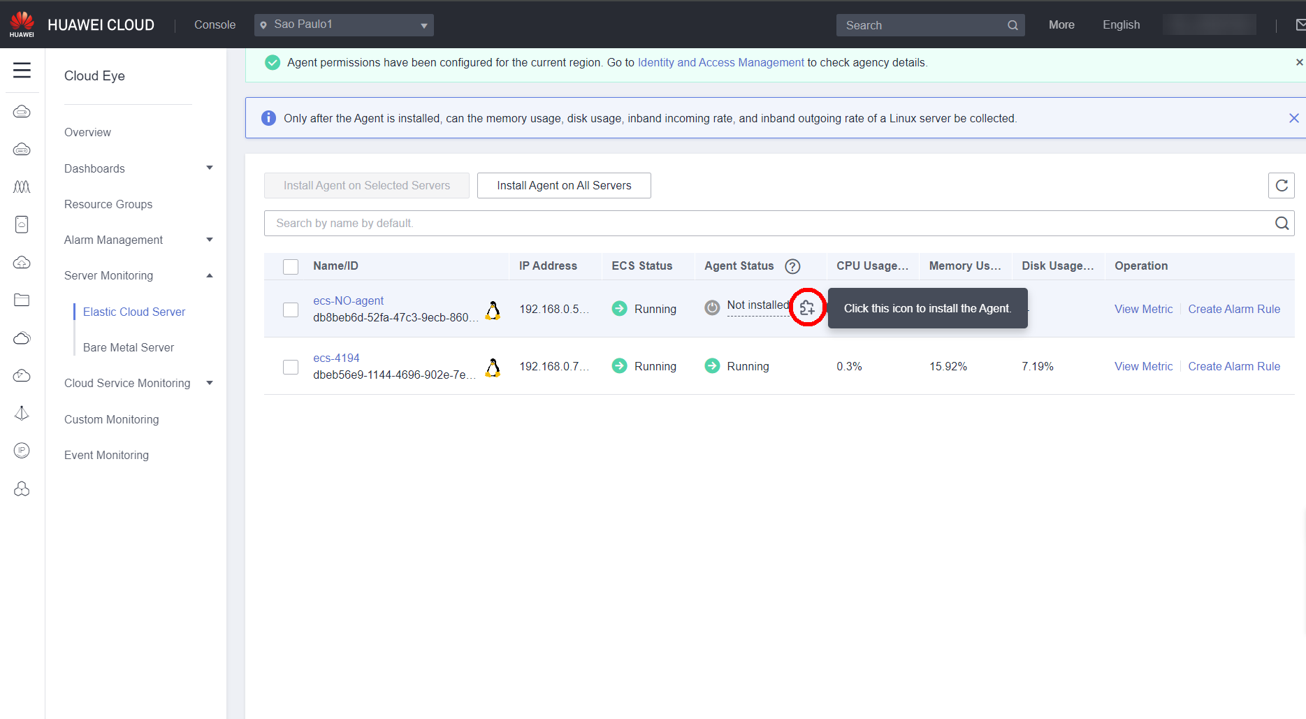 To install the agent automatically, simply click on the puzzle piece in the server monitoring section and in the agent status column in the corresponding ECS/BMS and wait for the agent to install.