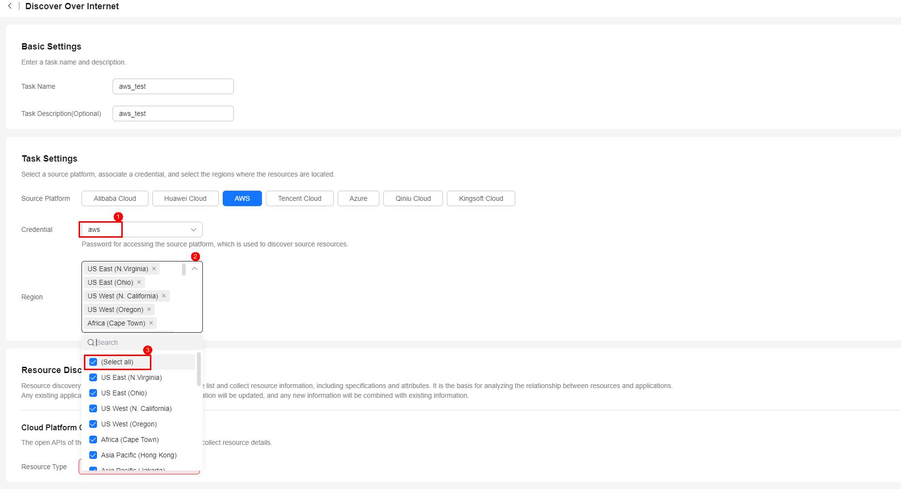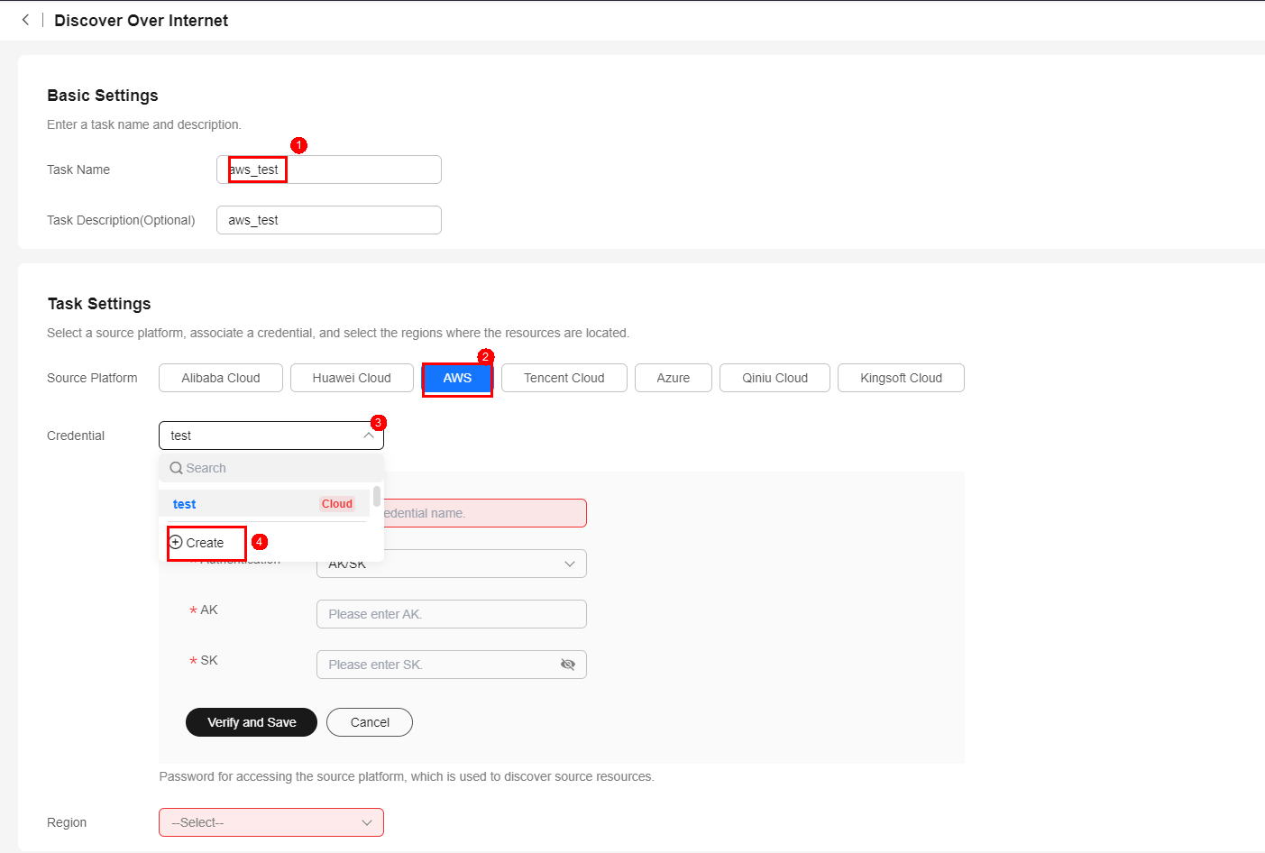 Fill in a name for the discovery task and the cloud provider in which the account whose resources will be analyzed is located. Then, in Credential, click on the Create option.