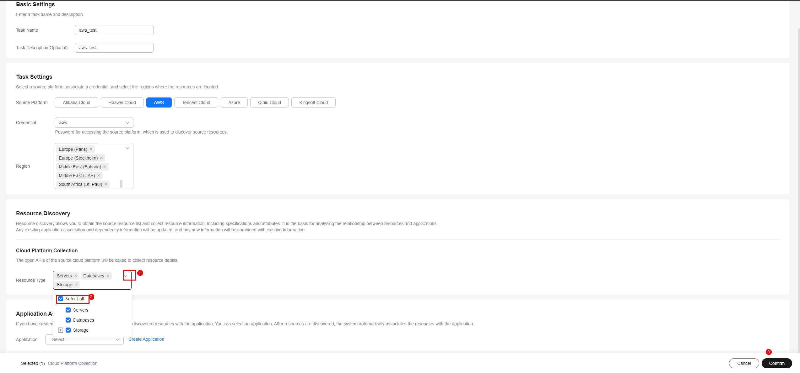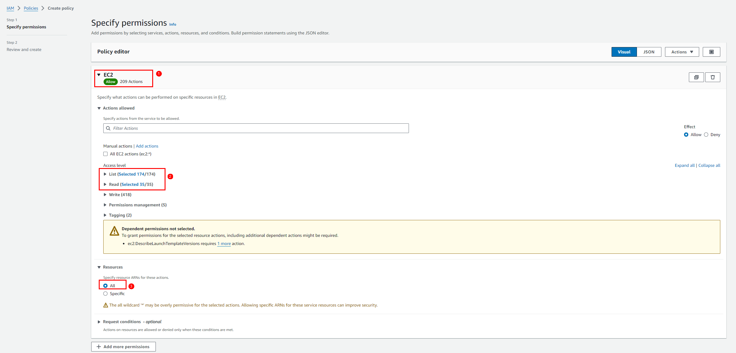 To perform resource discovery in other cloud providers, it is first necessary to generate an AK/SK or ID and Key with read-only and list permissions for all resources in the respective cloud for the following services: EC2, RDS, S3, and EFS. Below is an example of the policies and read-only permissions required for the EC2 service:
