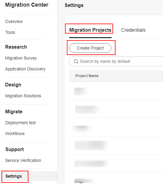 To perform resource discovery for a given account, first log in to the MgC service section in the Huawei Cloud console. In the lower left corner, choose the Settings option and then Migration Projects. Click Create Project.