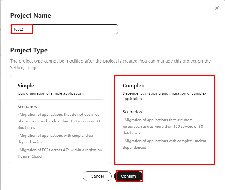 Choose a name for the project to be created and choose the project type Complex, in which there are several applications running whose dependencies are not well defined. Then click Confirm to create a project.