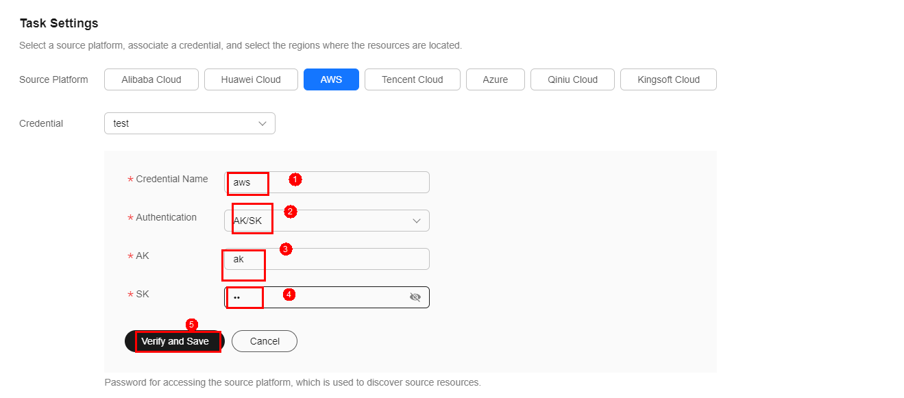 Fill in a name for the credential and in Authentication select the AK/SK or ID and Key option. Then, enter the key obtained in item 2.0 of this material and click Verify and Save.